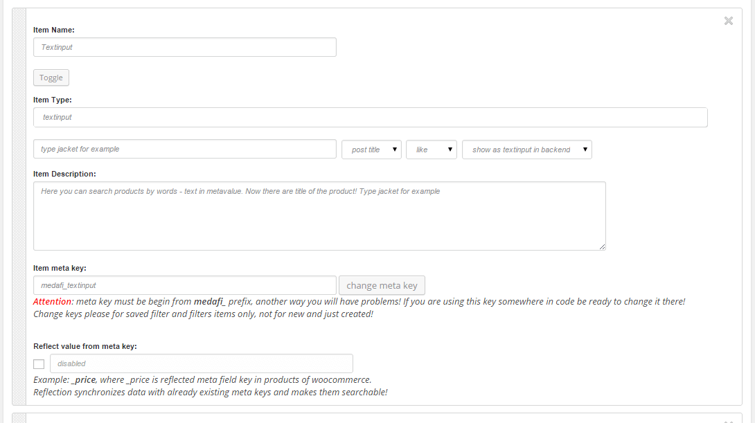 - Item meta key - by default its generated for example as medafi_544131696a66b. But if you want something more beauty you can in any time change its key name as on the previous screen - medafi_summer. The key must be beginning from 'medafi_' prefix. The same for another elements described below.